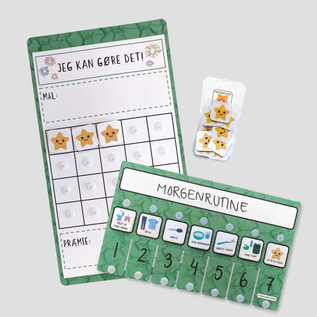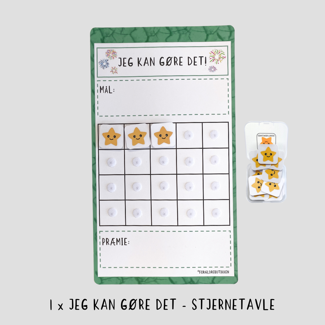 • Stjernetavlen med 20 stjerner (værdi 200 kr) – Hjælper med at visualisere fremskridt og fejrer hvert gennemført skridt med en stjerne.