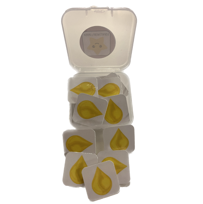 Æske med 20 piktogrambrikker med tis brikker Brikkerne har velcro og er et suplement til stjernetavlerne eller andre stjernebelønninger.